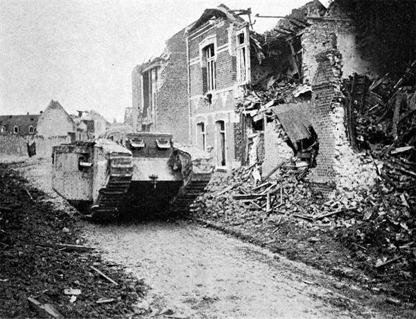 Ein britischer Tank durchquert eine Ortschaft bei Cambrai
